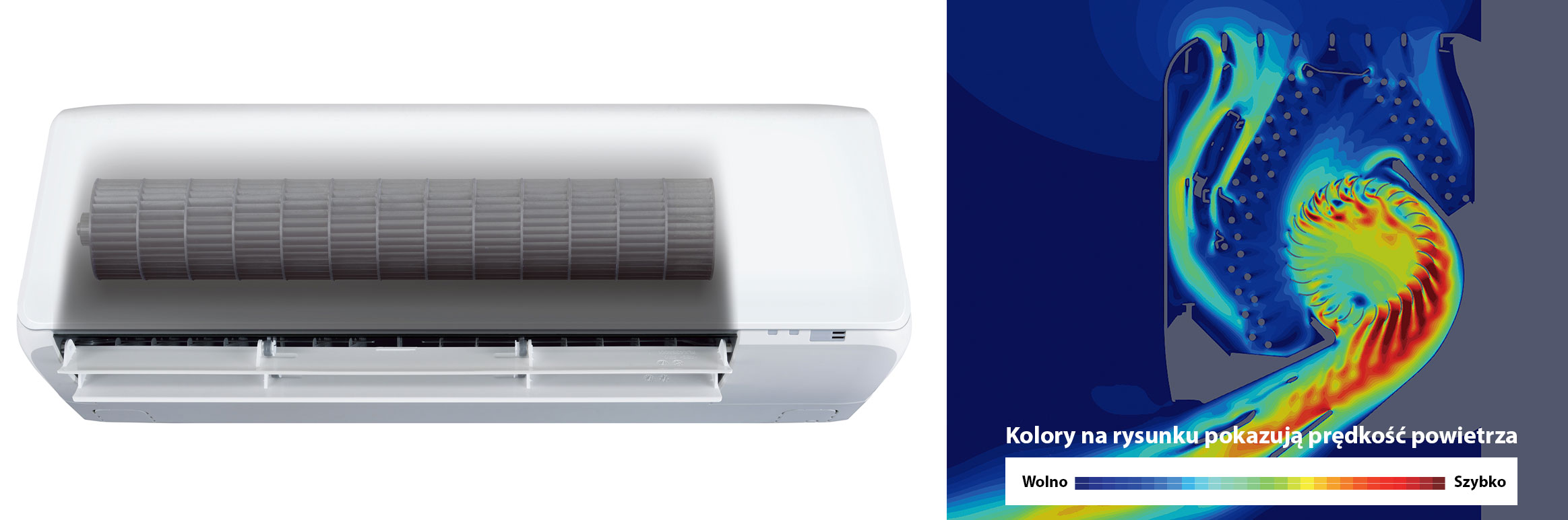 Pozwala to na równomierne i skuteczne rozprowadzanie chłodnego lub ciepłego powietrza w całym pomieszczeniu – nawet przy kompaktowych wymiarach urządzenia.